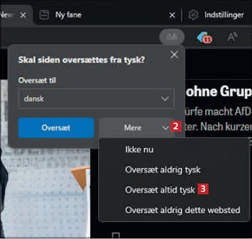 Nu åbner et lille vindue. Vil du altid have oversat hjemmesider fra det pågældende sprog, skal du klikke på Mere 2. Vælg Oversæt altid tysk 3 (eller et andet sprog)