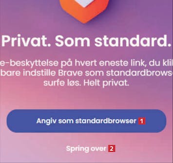 Hent Brave fra vores hjemmesi- de, og kør installationsfilen. Dette vindue åbner, og du kan vælge at gøre Brave til standardbrowser på din pc 1. I dette eksempel springer vi over 2.