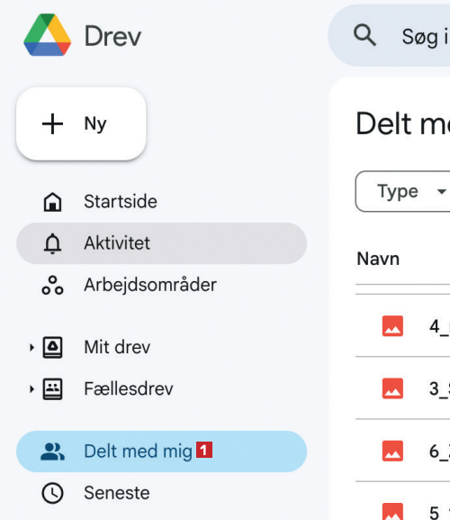 Åbn siden drive.google.com i en browser. Klik nu på Delt med mig 1 ude til venstre. Dermed vises en oversigt over alle de filer, som er delt med dig.