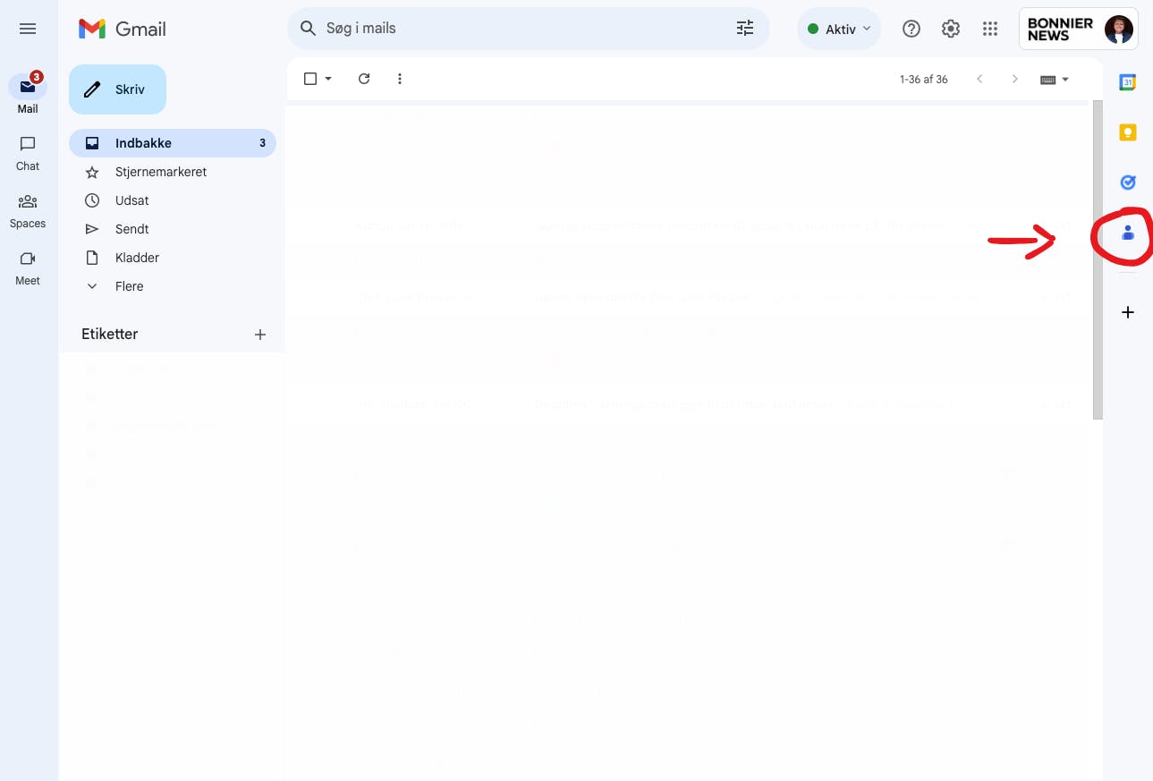 Men hvis du vil administrere dine kontakter direkte fra indbakken i Gmail på din pc, kan du få adgang til listen via menuen i højre side af din Gmail-forside. Her finder du et ikon, som tilnærmelsesvis ligner en menneskelig figur.