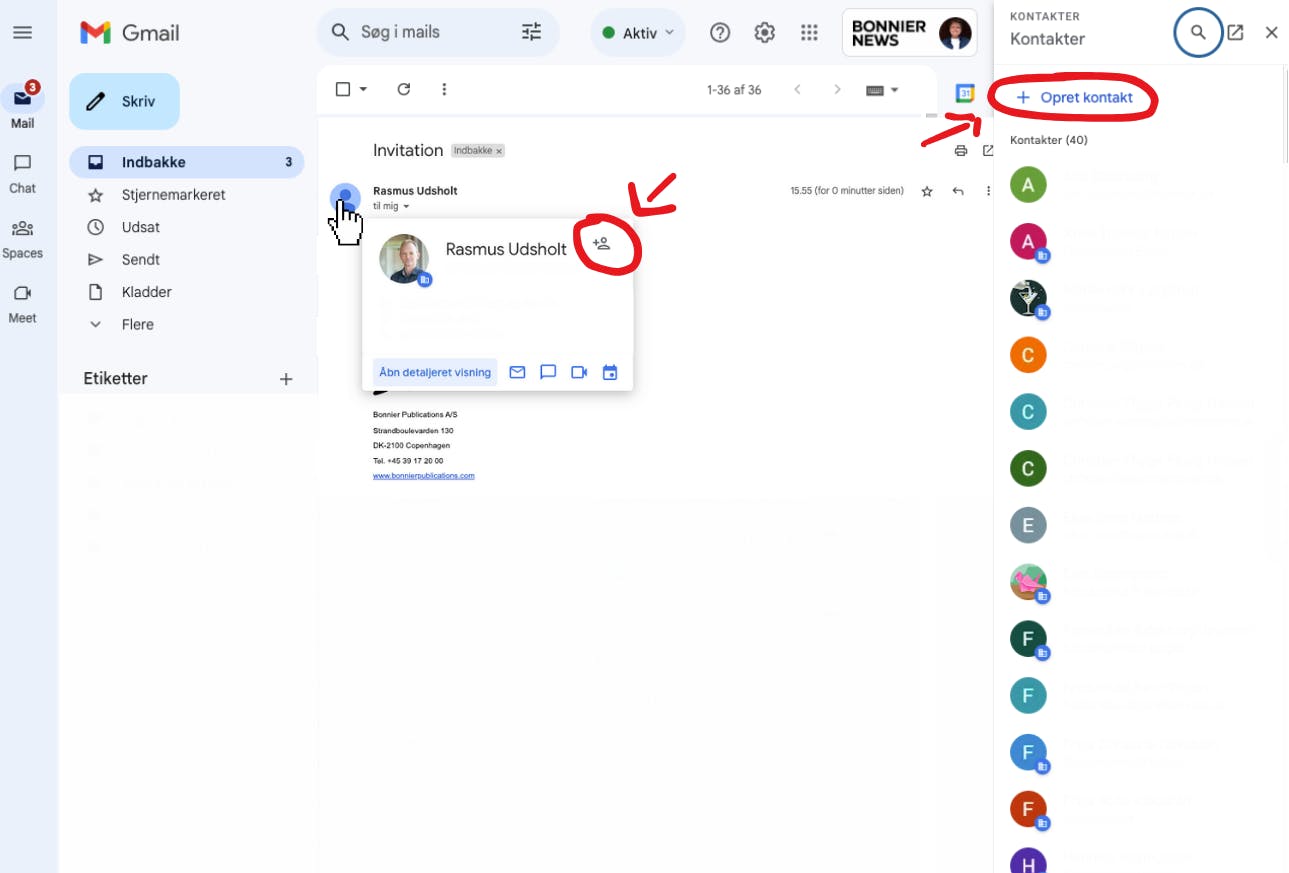 Du kan også tilføje en ny kontakt direkte fra en mail, du har modtager fra en person. Det gør du ved at gå til mailen i indbakken og holde musen over afsenderens navn, til der dukker en lille boks op med info om personen. Klik nu på ikonet med en person og et plus øverst til højre, og din kontakt er tilføjet adressebogen.