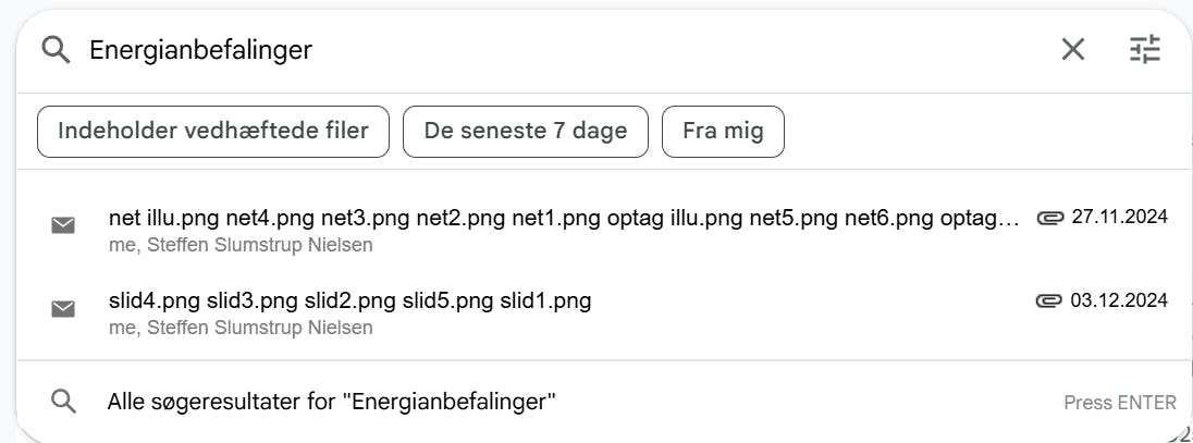 Jeg ville søge efter e-mails med et bestemt søgeord, "Energianbefalinger", og blev overrasket over listen med søgeresultater i min indbakke i Gmail.