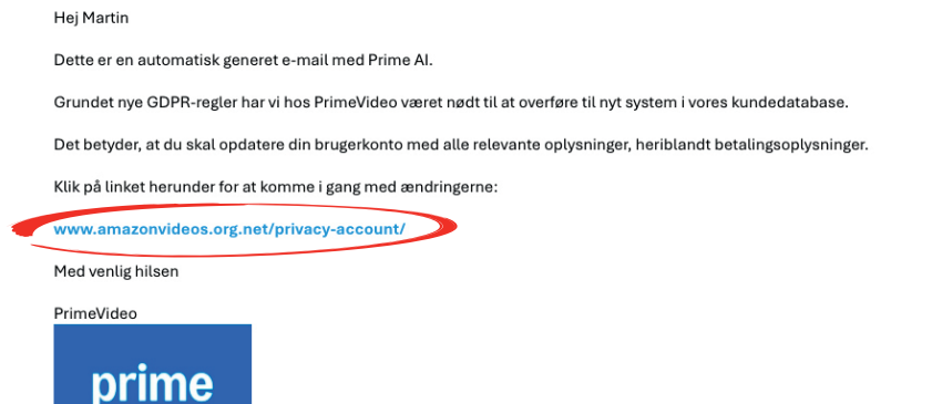 I ovenstående eksempel har man forsøgt at udgive sig for at være fra streamingtjenesten Prime Video, men linket, eller URL-adressen, som du bedes klikke på i mailen hedder “amazonvideos.org”, og det stemmer ikke overens med det virkelige domæne, som er “primevideo.com”.