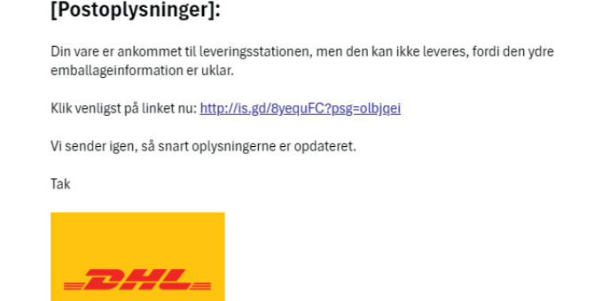 Mailen kan fx påstå, at der er problemer med modtageradressen, eller at der er opkrævet uventet told på pakken, som skal betales via et link.