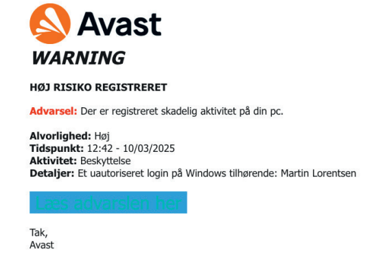 Mailen virker umiddelbart troværdig, og du føler måske, at du bør reagere, men den slags mail er næsten altid svindel. Her forsøger svindlere gennem phishing at franarre dig dine personfølsomme data som betalingsoplysninger, CPR-nummer eller adgangskoder.