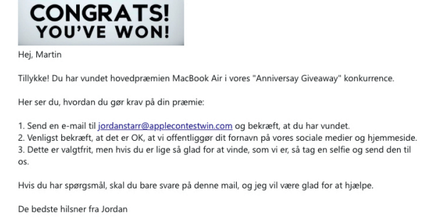 Får du en mail af denne type, bør du tjekke, om du har deltaget i den nævnte konkurrence. Tag eventuelt kontakt til afsender, men uden at klikke på noget her.