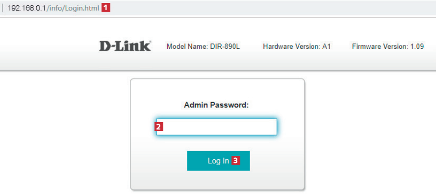 Åbn din browser. Indtast routerens adresse – det er typisk 192.168.0.1 1 (det står i routerens manual). Indtast koden til routerens styresider 2, og klik på Log in 3.