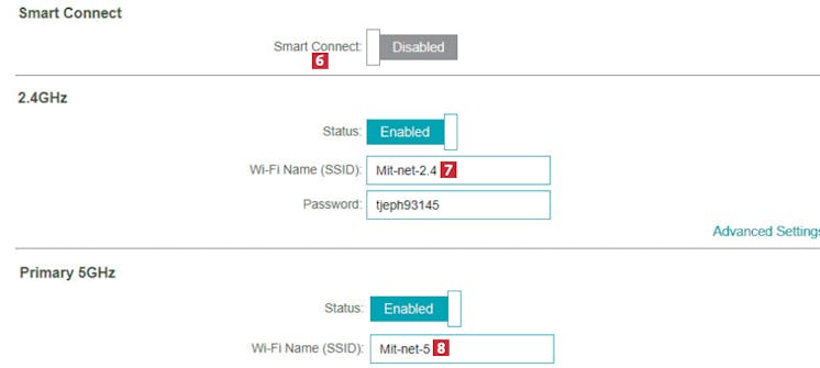 Hvis Smart Connect 6 er aktiveret, skal du deaktivere det. Det er en funktion, som smelter de to frekvenser sammen i samme navn. Skriv nu et navn til 2.4-GHz-netværket 7, og husk at inkludere 2.4 i navnet, så du kan genkende det. Udfyld også 5-GHznetværkets navn og skriv 5 som en del af navnet 8. Klik på Save.