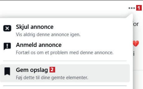 Besøg facebook.com. Når du falder over et spændende opslag klikker du på prikkerne 1 og vælger Gem opslag 2. Det samme kan du gøre, hvis du bruger Facebook på din mobil.