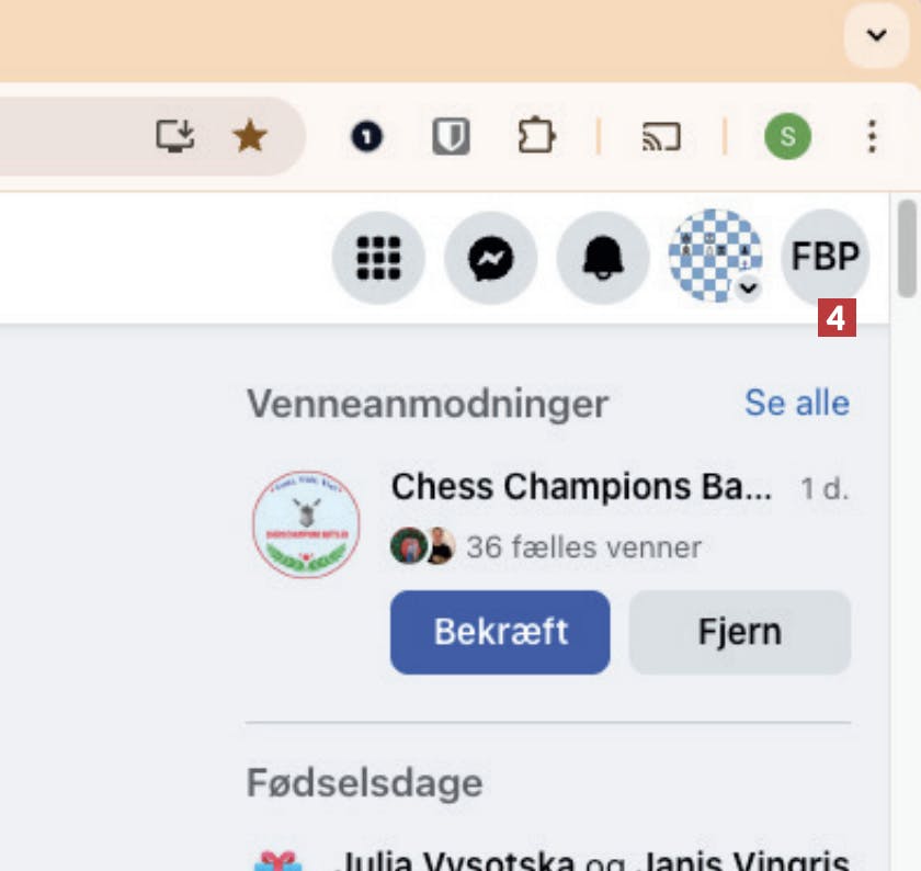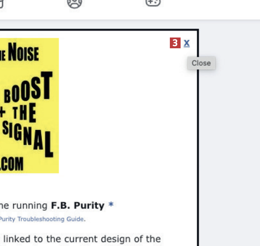 Besøg nu facebook.com i din pc’s browser. Klik derefter på krydset 3 for at lukke F.B. Puritys velkomstvindue.