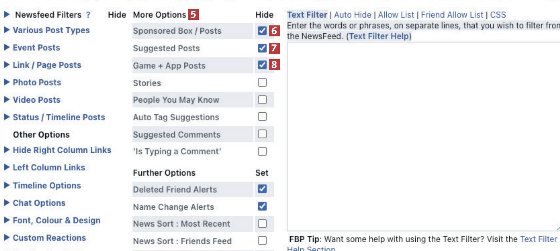 Dermed åbner F.B. Puritys indstillinger. Under More Options 5 sætter du markering ved Sponsored Box / Posts 6, Suggested Posts 7 og Game + App Posts 8. Dermed slipper du for annoncer, anbefalinger af opslag samt opslag om spil og apps.
