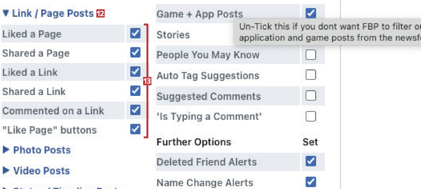 Gå til Link / Page Posts 12, og marker alle seks felter 13. Så slipper du for opslag om dine venners aktiviteter på Facebook-sider og i Facebook-grupper.