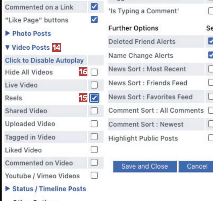 Gå til Video Posts 14. Sæt nu markering ved Reels 15 for at slippe for de korte Reels-videoer. Du kan også vælge Hide All Videos 16, hvis du slet ikke vil se videoer.