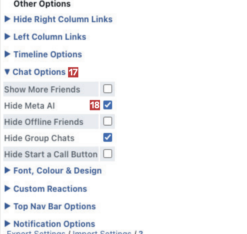 Vælg Chat Options 17. Sæt nu markering ved Hide Meta AI 18. Så fjernes den generende kunstige intelligens, som ligger øverst i din kontaktliste i chatdelen af Facebook.