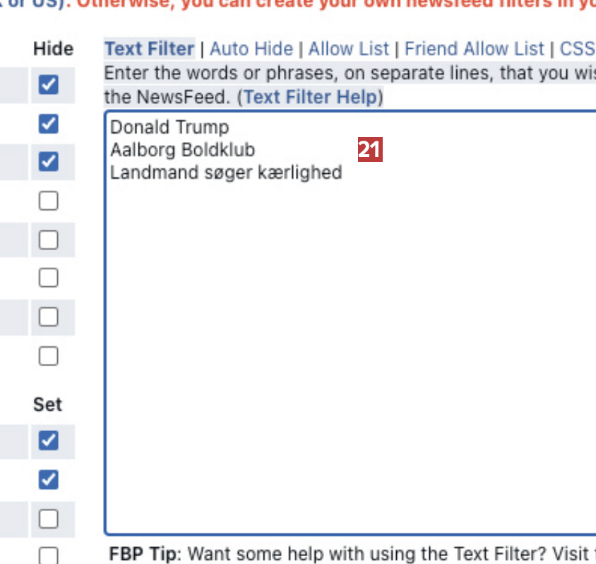 I feltet til højre kan du skrive ord eller fraser 21, som du ikke vil læse om på Facebook. Skriv hver frase på sin egen linje i boksen. Opslag med disse ord vil ikke blive vist fremover.