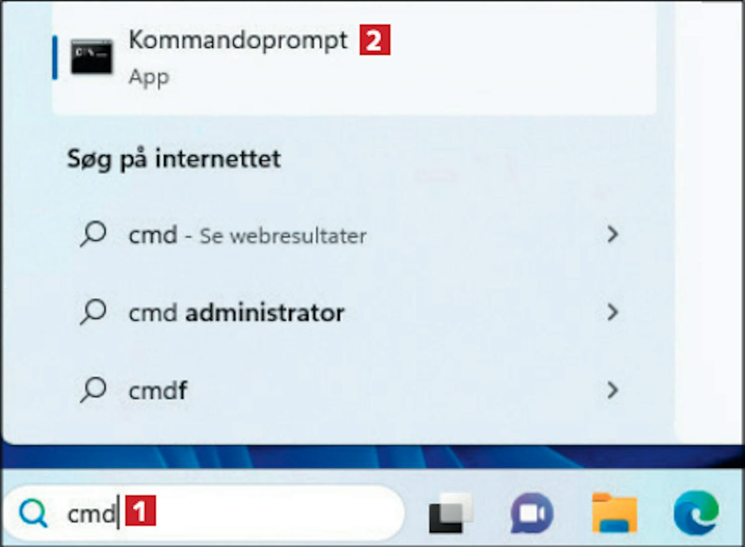 Metoden er ens i Windows 10 og 11. Begynd med at skrive cmd 1 i søgefeltet på proceslinjen, og klik så på Kommandoprompt 2 .