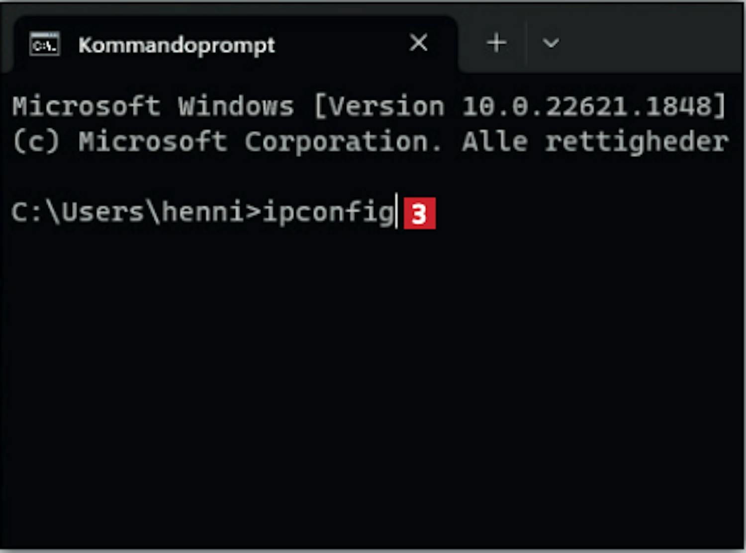 I vinduet, der åbner, skriver du nu ipconfig 3 . Tryk så på Enter.