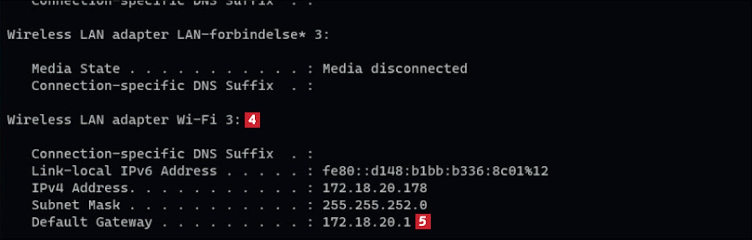 I oversigten under det netværkskort, du er tilsluttet netværket med 4, finder du din routers adresse ud for Default Gateway 5 . Indtast denne adresse i adressefeltet i din browser for at få adgang til routeren.