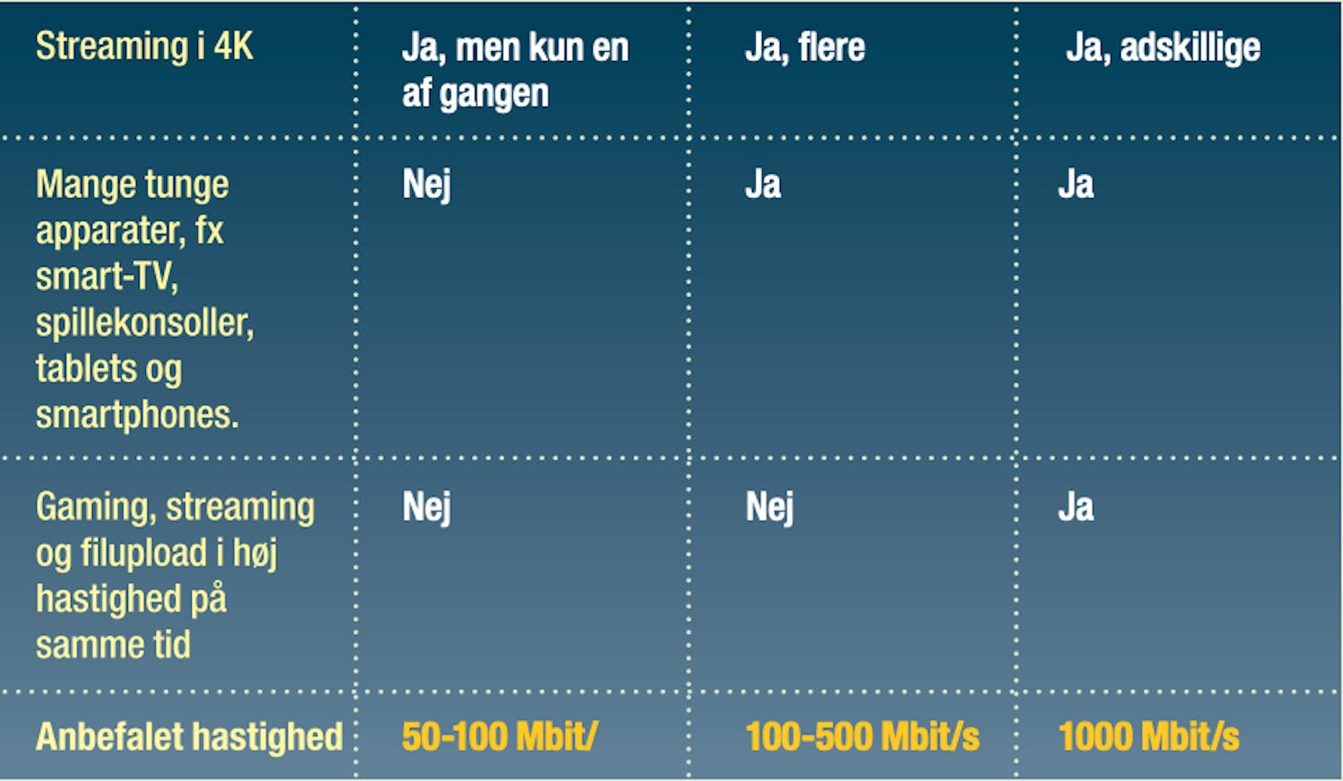 I vores skema kan du få en fornemmelse for, hvor høj en hastighed, der er nødvendig, alt efter hvor mange I er i husstanden, hvor meget, der er koblet på nettet, og hvad I foretager jer på nettet til daglig