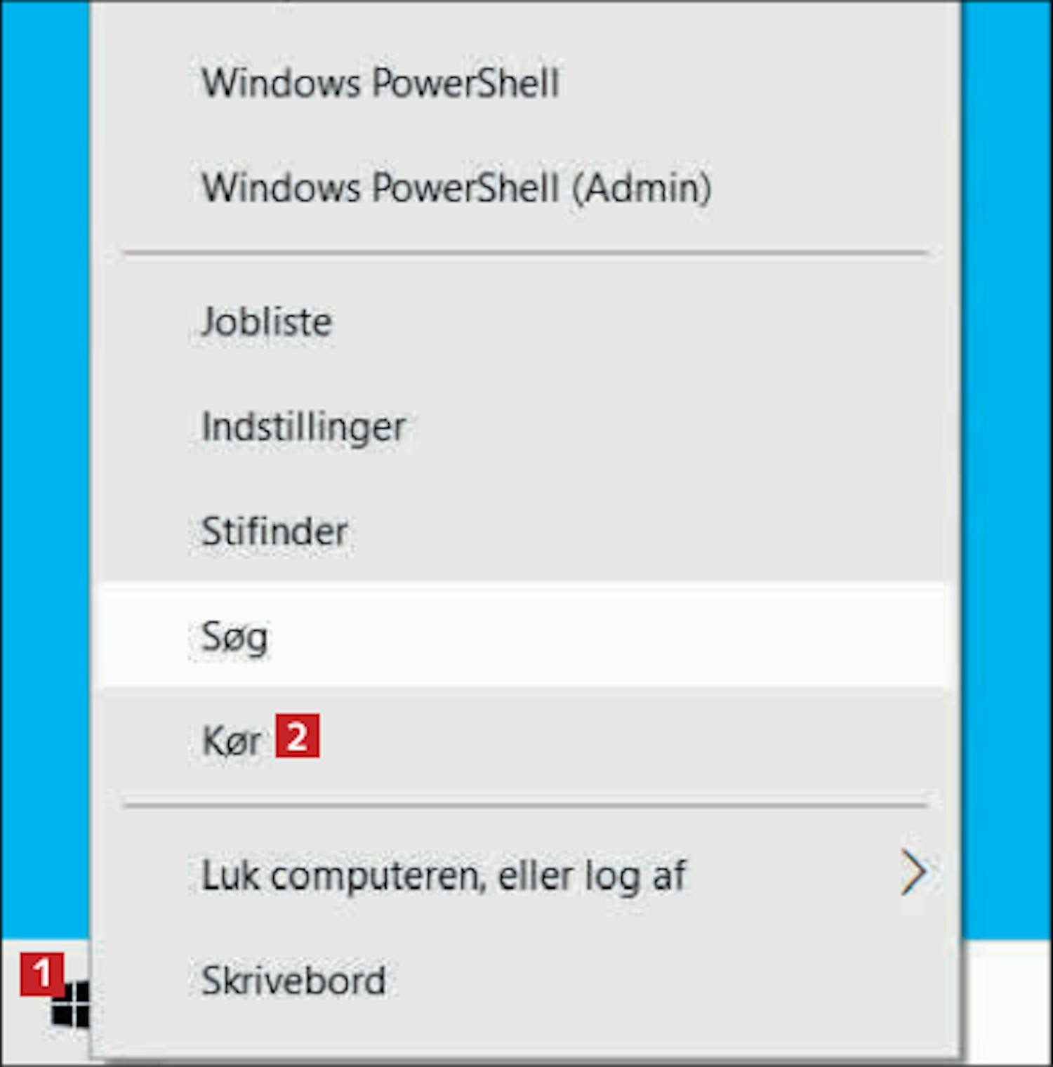 I Windows højreklikker du på startknappen 1 og vælger Kør 2 .