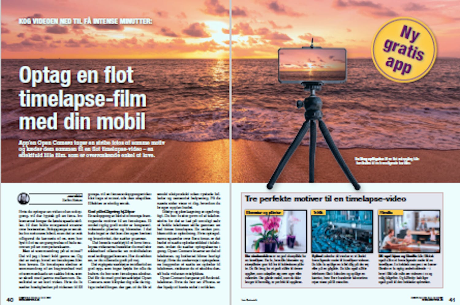 Har du sådan en, er du allerede godt på vej. Det vigtigste værktøj er imidlertid en god app, som tager højde for alle de behov, du har som timelapse-skaber. Det får du med gratisværktøjet Open Camera, som tilbyder dig alle de vigtige indstillinger, der gør, at du får et smukt slutprodukt uden rystede billeder og uensartet belysning. På de næste sider viser vi dig, hvordan du bruger app’en bedst. Udstyr og planlægning er også vigtigt. Du har fx stor gavn af et telefonstativ, for det er tæt på umuligt selv at holde telefonen stille gennem en hel times timelapse.