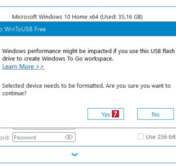 Du får at vide, at Windows på en USB-nøgle vil køre langsommere end fra din harddisk. Klik på Yes 7 for at bekræfte, at du vil tillade programmet at slette alt på USB-nøglen.