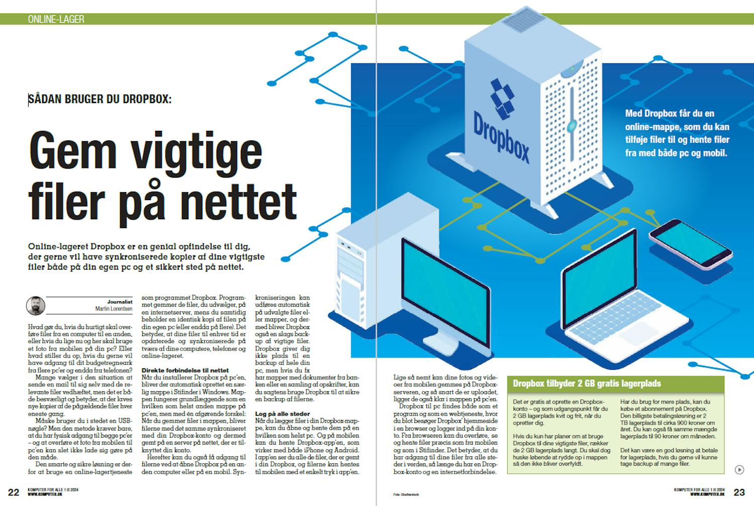 Hvad gør du, hvis du hurtigt skal overføre filer fra en computer til en anden, eller hvis du lige nu og her skal bruge et foto fra mobilen på din pc? Eller hvad stiller du op, hvis du gerne vil have adgang til dit budgetregneark fra flere pc’er og endda fra telefonen? Mange vælger i den situation at sende en mail til sig selv med de relevante filer vedhæftet, men det er både besværligt og betyder, at der laves nye kopier af de pågældende filer hver eneste gang.