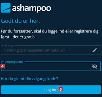 Hvis du allerede er registreret hos Ashampoo, skal du taste din adgangskode 4, og klikke på Log ind 5. Ellers får du en e-mail med et link til at oprette dig som bruger.