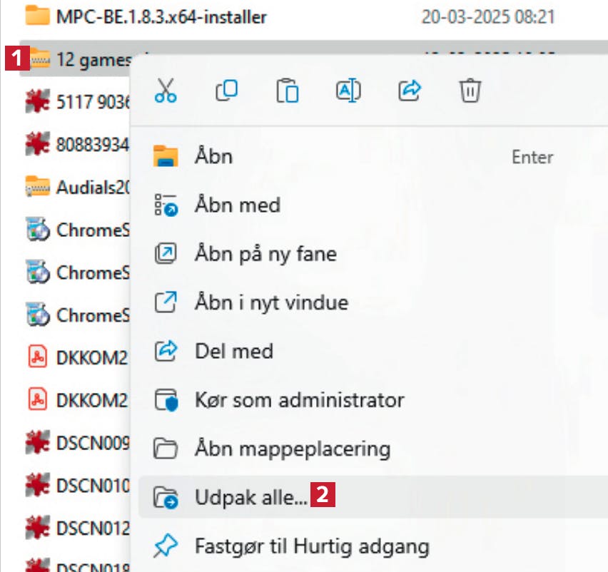 Hent spilpakken 12 sjove spil fra vores hjemmeside. Spilpakken hentes i en zip-fil, som du først skal pakke ud. Højreklik på den hentede fil 1 i Stifinder, og klik på Udpak alle... 2.