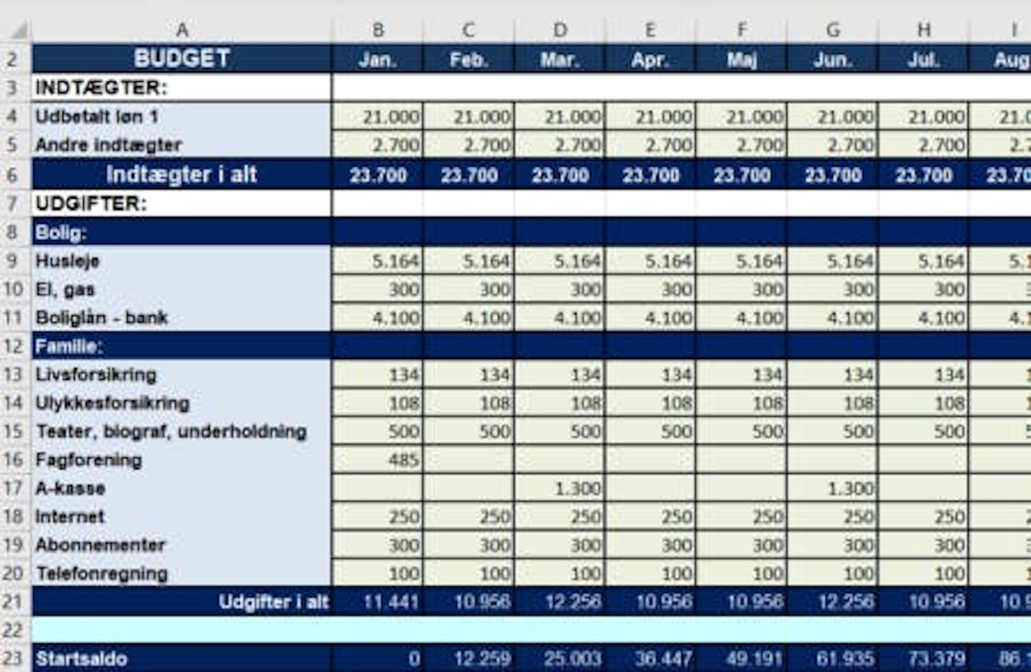 Når du bruger vores regneark til at lægge budget, skal du blot taste de tal ind, der passer til hver post – og så klarer programmet udregningerne for dig. Passer posterne ikke til dig, kan du dog nemt rette dem til. Vi viser, hvordan du bruger regnearket til at beregne indtægter og udgifter, og hvordan du justerer posterne, så de passer præcis til dig.