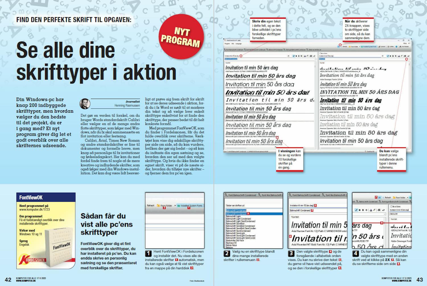 Værktøjet kan vise dig adskillige skrifttyper side om side, så du kan vurdere, hvilken der gør sig bedst – og så kan du indtaste din egen sætning og se, hvordan den ser ud med den valgte skrifttype. Og hvis du ikke finder en egnet skrift, viser vi på de næste sider, hvordan du tilføjer nye skrifter – og fjerner dem fra pc’en igen.