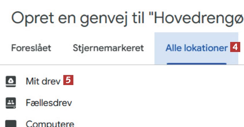 Klik så på Alle lokationer 4. Nu vælger vi mappen Mit drev 5, som ligger på forsiden af dit Google Drev. Den skal genvejen ligge i.
