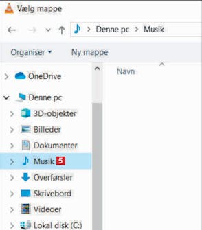 Vælg det sted 5 på pc’en, hvor VLC skal gemme filer. Klik så på knappen Vælg mappe nederst til højre i vinduet.