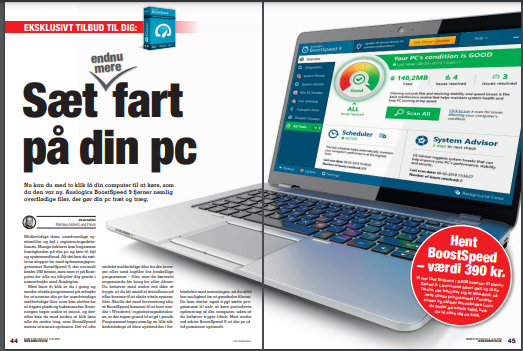 Komputer for alle kan helt eksklusivt tilbyde programmet Auslogics BoostSpeed 9, der normalt koster 390 kroner, til alle med et abonnement på Komputer for alle. Programmet gør det nemt at fjerne overflødige filer og frigøre hukommelse, så din computer føles hurtigere.