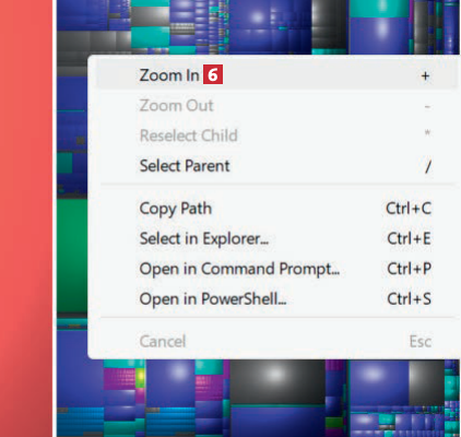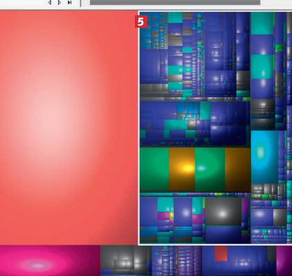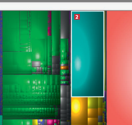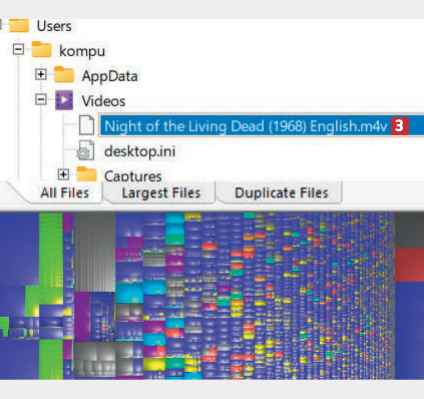 Hver firkant repræsenterer en fil på harddisken. Størrelsen af boksen viser, hvor meget filen fylder, og farven angiver, hvilken filtype, det er. Hvis du klikker på en boks, bliver filen vist i mappeoversigten ovenfor.