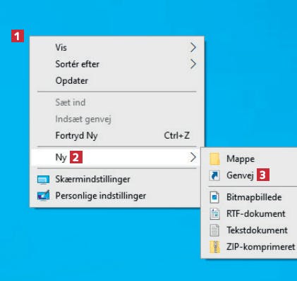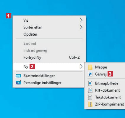 Hvis du vil oprette en genvej til et program, skal du først højreklikke på Skrivebordet 1 og føre musen ned til punktet Ny 2. Nu skal du klikke på Genvej 3.