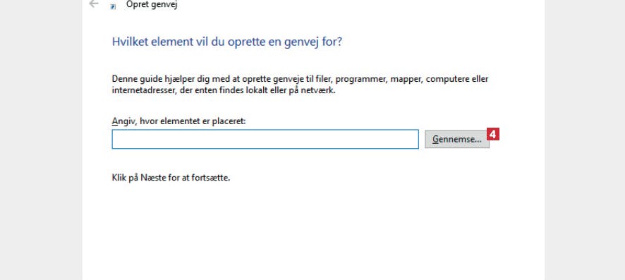 En lille guide åbner. Klik på Gennemse… 4 for at udpege det program, du vil oprette en genvej til.