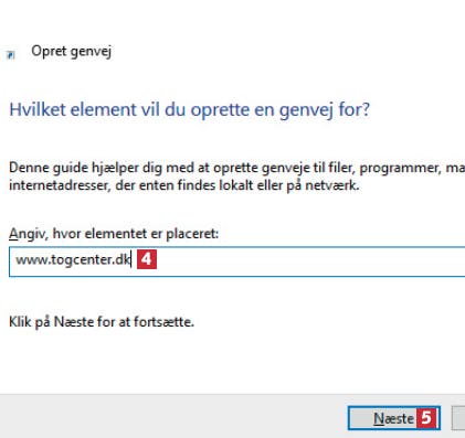 En lille guide åbner. Skriv nu adressen til den hjemmeside 4, som du vil oprette en genvej til. Klik på knappen Næste 5.