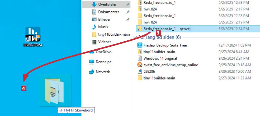 Straks er genvejen, der vises med en lille pil i ikonet, klar. Træk nu genvejen 3 fra Stifinder og ud på Skrivebordet 4.