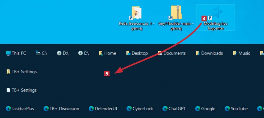 TaskbarPlus dækker den nederste del af Skrivebordet med et genvejspanel, der har en række faste genveje. Du kan tilføje dine egne genveje ved at trække dem 4 fra Skrivebordet og ned i TaskbarPlus-vinduet 5.