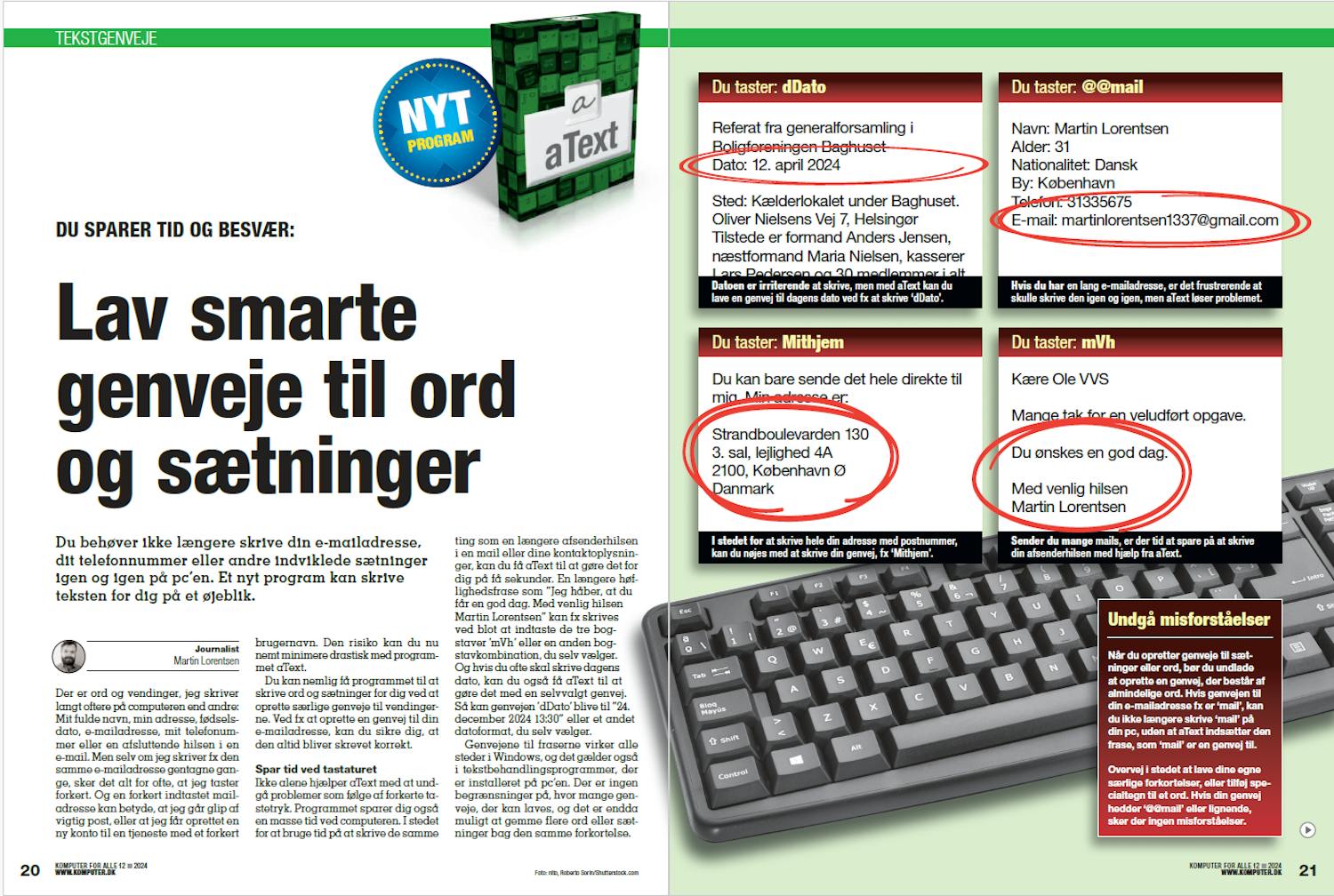 Der er ord og vendinger, jeg skriver langt oftere på computeren end andre: Mit fulde navn, min adresse, fødselsdato, e-mailadresse, mit telefonummer eller en afsluttende hilsen i en e-mail. Men selv om jeg skriver fx den samme e-mailadresse gentagne gange, sker det alt for ofte, at jeg taster forkert. Og en forkert indtastet mailadresse kan betyde, at jeg går glip af vigtig post, eller at jeg får oprettet en ny konto til en tjeneste med et forkert brugernavn. Den risiko kan du nu nemt minimere drastisk med programmet aText. Du kan nemlig få programmet til at skrive ord og sætninger for dig ved at oprette særlige genveje til vendingerne. Ved fx at oprette en genvej til din e-mailadresse, kan du sikre dig, at den altid bliver skrevet korrekt.