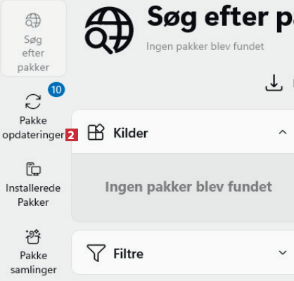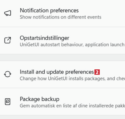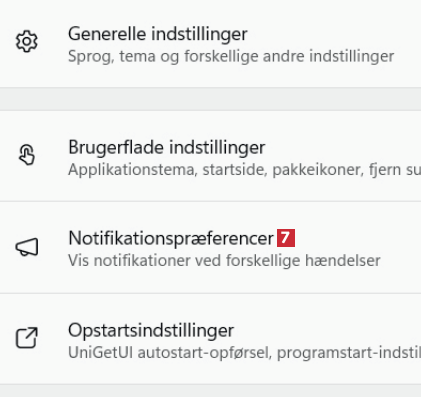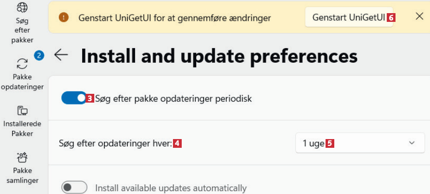 Slå skydeknappen til ved Søg efter pakke opdateringer periodisk 3. Ved Søg efter opdateringer hver: 4 vælger du 1 uge 5. Klik på Genstart UniGetUI 6. Programmet genstartes. Du får fremover besked, når der er nye opdateringer klar.