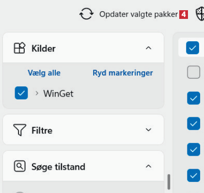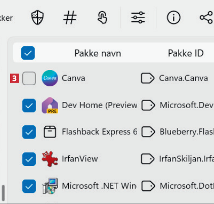 En liste med opdateringer vises. Hvis du ikke ønsker en bestemt opdatering, fjerner du markeringen 3.