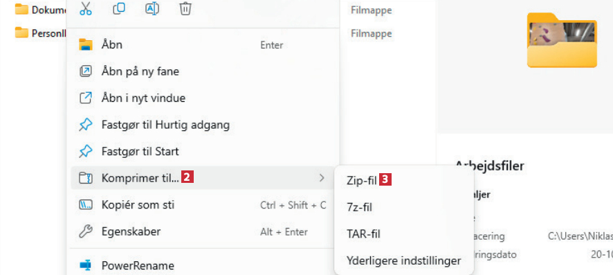 I menuen skal du vælge Komprimer til… 2 og dernæst vælge Zip-fil 3. Bruger du Windows 10, skal du i stedet vælge punktet Send til i højrekliksmenuen og så vælge Zip-komprimeret mappe.
