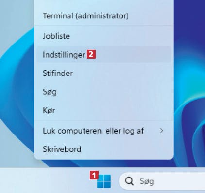 Højreklik på Start-knappen 1 i Windows og klik så på punktet Indstillinger 2. Herefter åbner vinduet med Windows’ indstillinger.