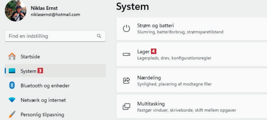 Klik på System 3, og derefter på Lager 4 i menuen til venstre (Windows 10) eller i midten (Windows 11).