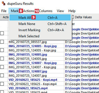 Nu vises alle dubletter i de mapper, du har valgt at undersøge. Vælg Mark 8 fulgt af Mark All 9. Vælg derefter Actions 10 efterfulgt af Send Marked to Recycle Bin.
