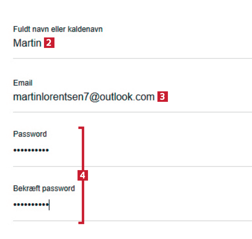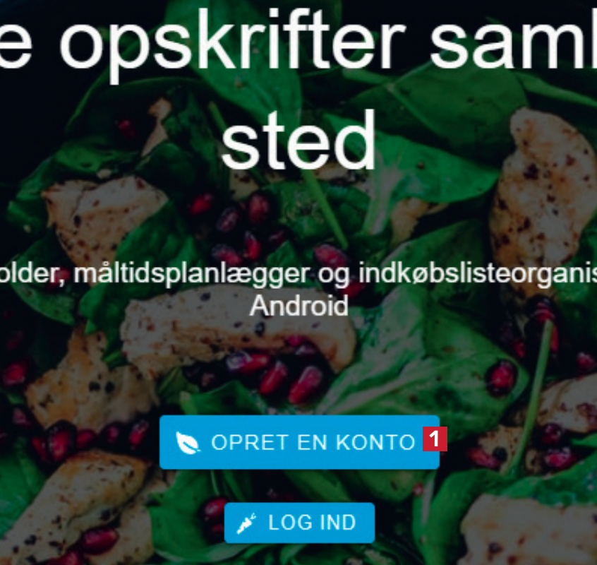 Skriv navn 2, e-mail 3, og opret et kodeord 4. Du kommer ikke til at modtage reklamemails efterfølgende. Kontoen skal oprettes, så du får serverplads til dine opskrifter.