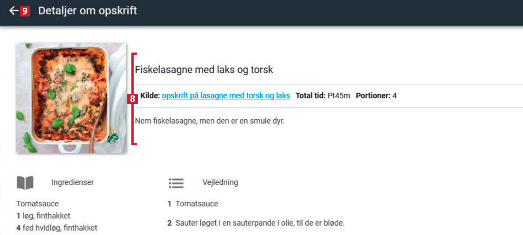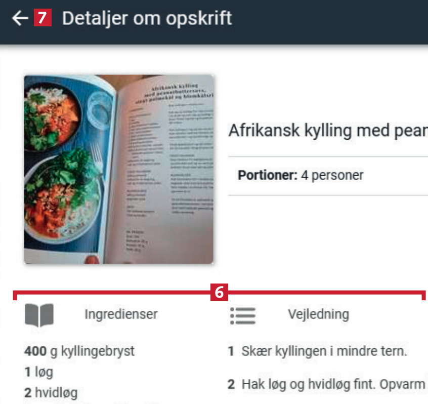 Du har tilføjet opskriften til din samling. Den rummer både ingredienslisten og fremgangsmåden 9 fra hjemmesiden. Klik på pilen i venstre hjørne 10 for at vende tilbage til programmets hovedmenu.