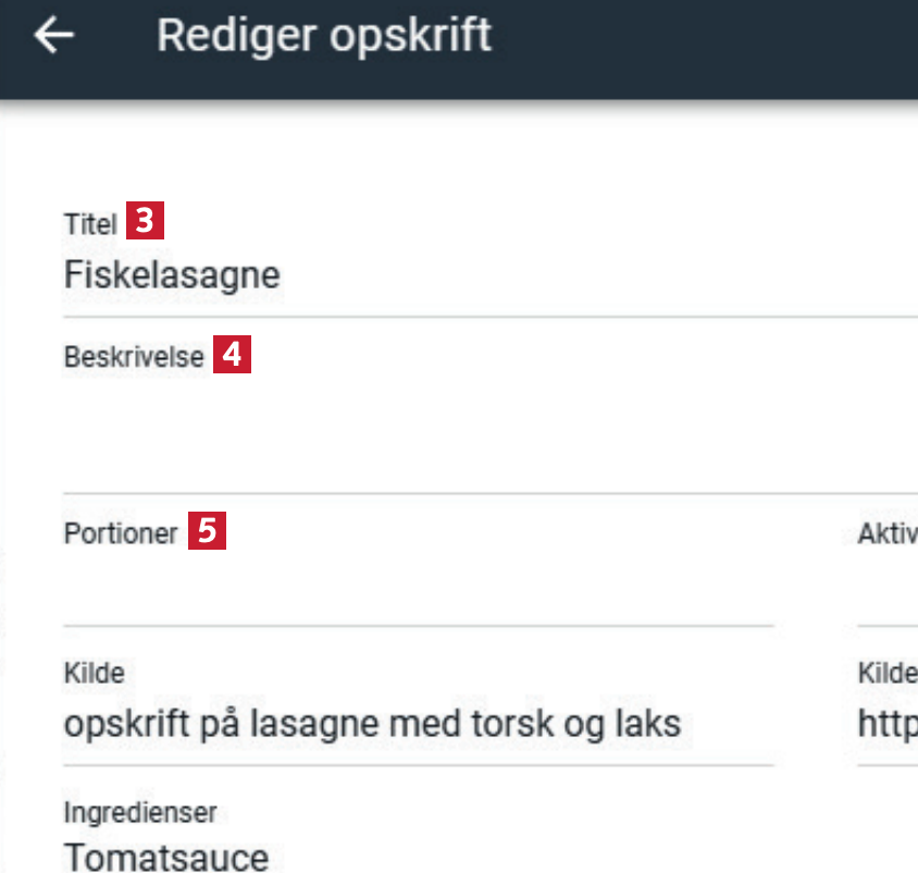 Under Titel 3 kan du skrive en ny titel. Ved Beskrivelse 4 kan du give opskriften en beskrivelse, og under Portioner 5 angiver du, hvor mange portioner opskriften passer til.